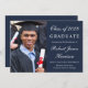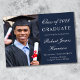 Einfache und moderne dunkelblaue Uni-Abschluss-Ankündigung mit einem Foto des Absolventen, seinem Namen und Klassenjahr in einem eleganten weißen Drehbuch und seiner Universität, Dur und Ehren in weißer Typografie.