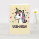 This card features the head of a cute, mythical horse-like creature set against a creamy yellow background, with a crisp black outline that makes the white face stand out. Its large black eyes, tiny lashes, and a soft rosy blush give it a tender, affectionate look that feels like a warm hug ❤️. A spiral horn rises from the forehead, striped in yellow and black with a pale blue base, adding a dreamy touch. The flowing mane sweeps to the side in gentle waves of pastel pink, light blue, and teal, like a soft ribbon drifting in the air. Below the illustration, the text “UNI-MOM” sits centered in rounded, puffy letters filled with a light blue-to-pink-to-white gradient and edged in black. Small hearts and star shapes sprinkled around the character add a sweet, friendly energy 🌼. Pastel hearts, stars, and tiny dots in pink, purple, teal, and light blue scatter across the background like confetti around the centered word.