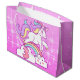 Ein niedliches Einhorn läuft auf einem farbenfrohen Regenbogen in einem rosa und funkelnd Himmel.