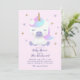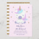 Magische und zauberhafte Babydusche mit einem Cartoon, das mit rosa und minzfarbenem Ober-Haar und goldfarbenem Horn eingetaucht ist. Um das Einhorn herum gibt es lila und vergoldete Sterne. Die Rückseite der Karte ist ein goldener Glitzer Streifen. Holen Sie sich diese einzigartige und trendige Einladung für Ihre einzigartige Babydusche! Die Texte sind online leicht editierbar.