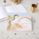 Einhorngeburtstag Gästebuch mit hübschem pastellfarbenem Einhorn auf Regenbogen- und Goldwolkenhintergrund. Dieses einzigartige Gästebuch lässt sich leicht an Ihre Veranstaltung anpassen, indem Sie einfach den von Ihnen gewünschten Schriftart hinzufügen. Sie können auch die Hintergrundfarbe in diesem bezaubernden Einhorn Geburtstagsgast-Buch ändern. Dies ist ein gedrucktes Design ohne echten Glitzer.