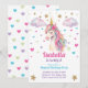 Celebrate a magical unicorn birthday with this adorable watercolor unicorn invitation. This sweet design features a beautiful unicorn with a flowing rainbow-colored mane, sparkling gold horn, and soft watercolor details surrounded by pastel hearts, clouds, and glittering stars.