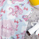 Begeben Sie sich zum Strand mit diesem zauberhaften mit Monogramm Badetuch, das auf einem weichen blauen Hintergrund auf Wolken schwebende Rosa Unicorns und Pegasus zeigt. Weiße Rahmen mit weichem pinkfarbenem Hintergrund und Kindername und Erstausstattung für eine persönliche Touch. Suchen Sie in meinem Geschäft nach passenden Produkten.
