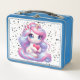 Diese Lunchbox wird mit einem niedlichen Einhornkunstdruck gezeigt. Lunch Box Farbe ist Light Blue Passen Sie dieses Objekt an oder kaufen Sie, wie es ist. Lizenziertes Bild