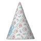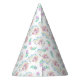 Das Design zeigt ein nahtloses Muster von majestätischen Einhornköpfen mit pastellfarbenen, fließenden Mähnen in Rosa-, Blau- und Gelbtönen, die mit Glitzern verziert sind. Die Einhörner haben ausdrucksvolle Augen und goldene Hörner, die ihnen ein magisches und elegantes Aussehen verleihen. Sie sind von zarten Blume umgeben, die in Rosa, lila und Blau gehalten sind und von grünen Zweigen begleitet werden. Der weiße Hintergrund hebt die lebendige und skurrile Ästhetik des Musters hervor und macht es verträumt und bezaubernd.
