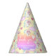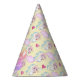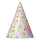 Das Design zeichnet sich durch ein sich wiederholendes Muster eleganter Einhornköpfe mit fließenden pastellfarbenen Mäusen in Rosa, Blau und Gelb aus. Die Einhörner haben ausdrucksstarke Augen und goldene Hörner, die ihnen ein magisches und traumatisches Aussehen verleihen. Sie sind umgeben von flauschigen rosa Wolken und glänzenden rosa Herzen, alles Set vor einem weichen gelben Hintergrund. Die Kombination von Elementen schafft eine skurrile und bezaubernde Ästhetik.