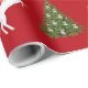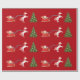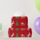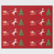 Elegantes, minimalistisches Weihnachtspapier mit einem Einhorn, das den Schlitten des Weihnachtsmannes in einen mit silbernen Bauern dekorierten Tannenbaum zieht. Das Einhorn hat eine rote und goldene Mane und Schwanz, und der Schlitten trägt den Weihnachtsmann mit vielen Geschenken. Auf einem weihnachtlich roten Hintergrund.