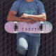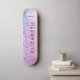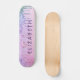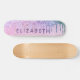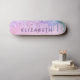 Personalisierte gürtelförmige Skateboard mit eintönigen Regenbogenfarben von Imitaten Glitzer tropfen vor einem rosa Hintergrund. Fügen Sie einen Namen in einer lila Typografie hinzu.