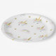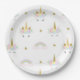 Teller mit hübschen pastellfarbenen Einhörnchen und Regenbogen auf weißem Hintergrund.
