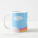Entworfen mit einem weißen und rosa Einhorn, das über den Regenbogen über dem blauen Himmel geht. Die Weißwolken und -punkte fügen eine Atmosphäre von Träumen und von Magie hinzu.