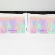 Ein angesagter holografischer Hintergrund mit Einhorn- und Regenbogenpastellfarben in Rosa, lila, Rose Gold, Minzgrün. Dekoriert mit Imitaten Glitzer Tropfen in Rose Gold, Rosa und lila und ein Regenbogen gefärbt Einhorn. Personalisieren und fügen Sie einen Namen auf der Vorderseite, geschrieben mit einem mädchenhaften modernen Stil Schrift. Lila Buchstaben. Zurück: farbiger Hintergrund und Imitate Glitzer Tropfen. Ohne Namen.