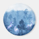Mystical, fantasy design of unicorns in a misty pine forest. Hand painted watercolors.