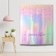 Ein trendiger, regenbogenfarbener Hintergrund mit Einhorn- und Regenbogenpastellfarben in Rosa, lila, Rose Gold, Minzgrün. Dekoriert mit Imitaten Glitzer Tropfen in Rose Gold, Rosa und lila. Dekoriert mit einem Regenbogenfarbenen Einhorn. Personalisieren und fügen Sie einen Namen, geschrieben mit einem modernen handgeschriebenen Stil Skript mit Swashes. Lila Buchstaben. Um die Swashes behalten, löschen Sie nur den Beispielnamen, verlass die Leerzeichen oder Emoji's vor und nach dem Namen.