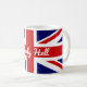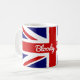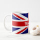 Die farbenfrohe rote und blaue Flagge von Union Jack im Vereinigten Königreich mit einem lustig bekannten Slang Swear Wort Zitat, "Bloody Hell". Das Wort blutig ... ist eine Korruption Gottes Blut, eine Phrase, die bis ins 17. Jahrhundert benutzt wurde... die Hölle wurde später hinzugefügt. Dieser Idiom ist eine sehr informelle und unhöfliche Art, große Wut auszudrücken. Sie können diesen Text mit jedem beliebigen anderen Text Ihrer Wahl bearbeiten oder sogar ganz löschen, wenn Sie die Tasse ohne ihn bevorzugen.