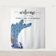Eleganter Pfauenhochzeitungsbanner/ Fotostand/ Foto Hintergrund/ Dekortapezierung zeigt eine wunderschöne Grafik eines blauen und bräunlich-goldenen Pfaues + Text "welcome" in prächtiger texturierter Kalligraphie-Schrift.