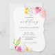 Make a bold statement with these unique wedding invitation shapes, featuring watercolor pink flowers and bold floral blooms in vibrant shades of pink, peach, and lavender. Designed with a modern flair, these bold wedding invitations bring a touch of elegance and creativity to your special day.