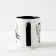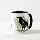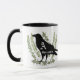 Eine einzigartige und auffällige unisex monogramm Rabe Geist Tasse. Eine Silhouette mit schwarzem Rabe sitzt über Zweigen eines grünen Eukalyptus mit einem grauen Monogramm-Brief in der Körpermitte. Die Namenspersonalisierung liegt direkt unter dem Monogramm-Buchstaben und passt in den unteren Teil des Rabe-Körpers. Auf einer zweifarbigen Schwarzweiß-Tasse dargestellt. Cooles Geschenk für Menschen, die Ravens und Crows Liebe!