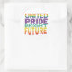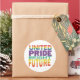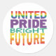 "United Pride Bright Future" in kühnem, farbenfrohen Design. Der Text ist der Hauptfokus, die Bühne in der Mitte auf dem Aufkleber Stellen Sie sich ein lebendiges Farbspektrum vor, das über die Worte verteilt ist und ein Gefühl der Einheit und des Optimismus schafft. Es gibt keine Bilder von Leuten auf diesem Design, lassend die mächtige Botschaft allein stehen.