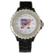 Die Flagge der USA fliegt hinter einem Fußball oder einem europäischen Fußball auf dieser Armbanduhr. Der Ball ist auch in den Farben der amerikanischen Flagge. Unten sehen die Buchstaben USA rot, weiß bzw. blau. Die Buchstaben sind grau dargestellt, um auf mehr als einem farbigen Hintergrund gut sichtbar zu sein.