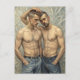 This compelling canvas portrays two powerful male figures in a close, tender embrace, characterized by a bold, expressive artistic style with highly visible brushstrokes and a textured, abstract background. The technique, reminiscent of certain early modernist or post-impressionist explorations, lends the figures a striking, almost sculptural quality. Their strong physiques and confident poses, paired with a subtle, shared look, convey a deep sense of connection and quiet assurance. Clad in contemporary denim, the figures bridge the gap between classical appreciation of the human form and a modern, grounded sensibility. The lighting highlights the contours of their bodies, emphasizing both strength and vulnerability. This artwork is a testament to the beauty of male intimacy, rendered with a raw, painterly energy that makes it a powerful and sophisticated statement piece for any collector seeking modern art with profound emotional resonance.