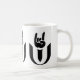 Eine weiße Tasse mit dem Logo für Chalice Cooper: Die universelle Universalist Rock Music Society darauf, in Schwarz.