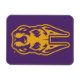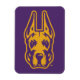 Dieses Design ist ein nahes up der University at Albany Great Dane Maskottchkopf. Die Illustration verwendet fett lila Konturen mit detaillierter Schattierung in Grau für das Gesicht des Großen Dänen, die seine Winkelzüge hervorheben. Die Augen sind scharf, und der Ausdruck vermittelt Wachsamkeit und Stärke. Goldakzente erscheinen auf beiden Seiten des Kiefers des Hundes, was dem ansonsten erbitterten Aussehen eine Touch Wärme verleiht. Die Ohren sind aufrecht und spitz, was das Gefühl der Bereitschaft und Autorität des Logos verstärkt. Das Design ist minimalistisch und dennoch leistungsstark, ideal für die Markendarstellung der sportlichen Identität von UBAlbany.