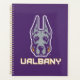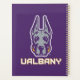 Das Maskottlogo der Universität Albany Great Dane zeigt eine stilisierte Darstellung des Kopfes eines großen Dänen. Der Hund ist illustriert mit scharfen, kühnen Linien in lila und grau, was ihm einen erbitterten, selbstbewussten Ausdruck verleiht. Die Ohren stehen hoch und symbolisieren Aufmerksamkeit und Stärke. Unter dem Kopf der Großen Däne steht das Wort "UBAlbany", geschrieben in fett gedruckten, blockigen goldenen Briefen, die lila umrissen wurden, was das Markenzeichen der Universität verstärkt. Dieses Design repräsentiert die Sportteams von UAlbany und unterstreicht Power, Loyalität und Entschlossenheit.