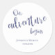Diese einfachen "Unser Abenteuer beginnt" runden Hochzeitsaufkleber zeigen Ihren eigenen Text in dunkelblau, der dem typografischen Element entspricht - von katz_d_zynes