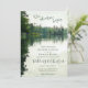 Für Ihre Hochzeitsfeier am See oder am Flussufer bietet diese rustikale Hochzeitskarte "Unser Abenteuer beginnt", die aus meinem persönlichen Kajakfoto erstellt wurde und mit einem subtilen digitalen Aquarelleffekt und typografischen Elementen ausgestattet ist, eine wunderschöne Naturszene unter einem bewölkten Himmel mit leicht geripptem, aber ruhigem Wasser, das entfernte Evergreens, Zedarbäume und Felsstrukturen reflektiert