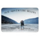 Ein rustikaler Magnet Save the Date für das Outdoorsy- und Abenteuerparadies, entworfen um Ihr Lieblings-Horizontal- oder Landschaftsorientiertes Vollblut-Verlobung-Foto unterzubringen. "Unsere Abenteuer Begins" erscheint als ein Text-Overlay, das oben mit Ihren Namen, Hochzeitstermin und Hochzeitsort am unteren Ende des Fensters angeordnet ist.