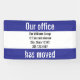 Dieses blaue und weiße Outdoor-Banner hat drei Felder. Zusammen sagen die blauen Felder: "Unser Büro ist umgezogen". Verwenden Sie das weiße Feld, um Ihre Postkarte mit dem Namen, der Adresse und der Telefonnummer Ihres Unternehmens anzupassen.