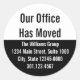 Dieser schwarz-weiß bewegende Ankündigungsaufkleber hat oben schwarzen Text. (Angezeigt: Unser Büro hat sich bewegt). Am unteren Rand ist ein weißer Bildschirmtext für den Namen Ihres Unternehmens und für die neue Adresse und Telefonnummer. Alle Texte können bearbeitet oder gelöscht werden.