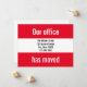 Diese strahlend weiße Ankündigung hat drei Felder. Zusammen sagen die roten Felder "Unser Büro ist umgezogen". Sie können den schwarzen Text im weißen Feld bearbeiten, um Ihre Postkarte mit dem Namen, der Adresse und der Telefonnummer Ihres Unternehmens anzupassen.