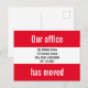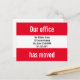 Diese helle und weiße Postkarte hat drei Felder. Zusammen sagen die roten Felder "Unser Büro ist umgezogen". Sie können den schwarzen Text im weißen Feld bearbeiten, um Ihre Postkarte mit dem Namen, der Adresse und der Telefonnummer Ihres Unternehmens anzupassen.