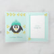 Mit einem niedlichen Pinguin, der einen Bauchhut und gelbe Goldsterne trägt.