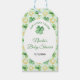 Ein charmantes Geschenk-Tag für eine St. Patrick's Day Babyshower mit einem sanften grünen Hintergrund, goldenen Hufeisen und verstreuten vierblättrigen Kleeblättern für ein süßes 'Glücksbringer'-Thema. Das zentrale weiße Oval umrahmt die Details der Veranstaltung wunderschön und schafft ein warmes, einladendes Design, das perfekt ist, um eine wachsende Familie zu feiern. Ideal für März-Feiern, irisch inspirierte Themen oder jede Babyshower, die Glück, Freude und neue Anfänge feiert.
