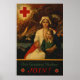 Ein Poster des Ersten Weltkriegs, das eine Krankenschwester des Roten Kreuzes zeigt, die ein junges Mädchen hält, wobei vier Pferde einen Krieg darstellen. Erstellt von Cornelius Hicks.