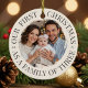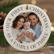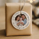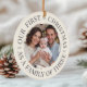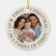 Moderne, runde Keramik mit Bogengewölbe UNSERE ERSTEN CHRISTMAS und gekrümmt als FAMILIE DREI Typografie. Ein weicher Pinselkreis umrahmt Ihr Foto, und das geteilte Jahr sitzt ordentlich an den Seiten. Sauber, zeitlos und perfekt für den ersten Urlaub mit dem Baby.