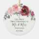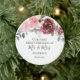 Schöne Blumenhochzeit Unser Erstes Weihnachtsfest als Mr. & Mrs. Keramik Ornament zeigt elegante, handbemalte Aquarellfarben-Blume in rot-rosa, bordeauxrot und weich-grauem Grün. An der Vorderseite befinden sich der Name und das Datum von Braut und Bräutigam. Das hintergrundinspirierende Zitat: "Zwei Leben vereint in Freundschaft, zwei Freunde in Liebe vereint, Eine Liebe vereint in Christus."_