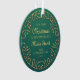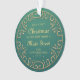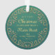 Erste Weihnachten in<add name of your street>Straße in klassischer und einfacher Serif und kursiv Skript Typografie auf einem grünen Hintergrund mit verzierten Imitaten Goldkurven.