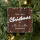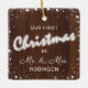 Erste Weihnachten verheiratete Baum-Ornament mit einem rustikalen Holzhintergrund, Schneeflocken, eine Foto-Collage der Neuvermählten und eine einfache mr & mrs Textvorlage für Sie zu personalisieren.