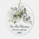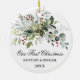Moderne elegante Watercolor Greenery Couple Unser First Christmas Ornament umfasst wunderschöne botanische Aquarellen, Eukalyptus-Blätter, Heilige Beeren und andere schöne Blätter.