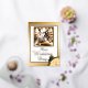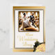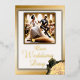 Schöne, elegante Hochzeitseinladung mit einem gedruckten Bild einer schönen Blumenhochzeit. Die Braut und der Bräutigam springen über den Besen, nachdem der Minister sagt: "Ich spreche jetzt Mann und Ehefrau aus." Echte Folie Einladung mit Farben aus Gold und cremig weiß. In der rechten Ecke befindet sich eine hübsche, wasserfarbene, gelbe Hydrangea-Blume.