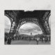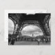 Unter dem berühmten Eiffelturm erobert dieses Foto die große Anzahl von Besuchern der Ikone. Unter dem Stahlrahmen dieser Postkarte befindet sich ein Schwarz-Weiß-Foto mit hunderten von Besuchern, die ihren Besuch genießen.