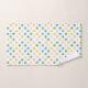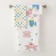 Farbenfrohe Kinder Badehandtuch Set, mit dem Handtuch in Weiß mit einem Muster von Cartoon Tintenfisch, Fisch, Muschel und Polka Punkte gemacht. Das Handtuch ist weiß mit gelben, rosa, grünen und blauen Polka-Punkten, und das Waschlappen hat einen großen blauen Fisch auf einem weißen Hintergrund. Das Set ist für ein kleines Kinderbad geeignet.