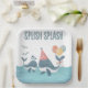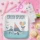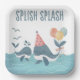 Niedliche Teller mit Babydusche, in denen Wale im Ozean schwimmen, mit Party-Hüten und Ballons und "Splash"-Beschriftung. Ideal für Strandfeiern und Festlichkeiten mit Wassersport.