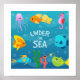 Poster mit einem kunstvollen Druck von Fischen unter dem Meer gezeigt. Passen Sie dieses Objekt an oder kaufen Sie, wie es ist.
