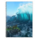 Eine gewaltige Welle springt von rauen Meeren hoch, funkelnd weiß, blau und türkisblau im strahlenden Sonnenlicht. Unter der Welle, kurz vor dem Untergang, ist eine kleine Stadt mit einer Burg und mittelalterlichen Hütten gebaut auf einem felsigen Landstück.