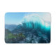 Eine gewaltige Welle springt von rauen Meeren hoch, funkelnd weiß, blau und türkisblau im strahlenden Sonnenlicht. Unter der Welle, kurz vor dem Untergang, ist eine kleine Stadt mit einer Burg und mittelalterlichen Hütten gebaut auf einem felsigen Landstück.