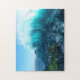 Eine gewaltige Welle springt von rauen Meeren hoch, funkelnd weiß, blau und türkisblau im strahlenden Sonnenlicht. Unter der Welle, kurz vor dem Untergang, ist eine kleine Stadt mit einer Burg und mittelalterlichen Hütten gebaut auf einem felsigen Landstück.